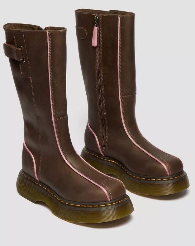 Step into archive energy. The Buzz Hi High boot brings back our iconic 90s boot attitude, now updated in dark brown Wyoming leather with a subtle pop of dusty rose piping. Rubberised branded patches, sport-inspired piping, and an adjustable riptape strap lock in fit, while an inside zip makes it easy to slip on. The chunky platform Buzz sole - air-cushioned, barrel-edged, and finished with yellow welt stitching - keeps every step grounded.